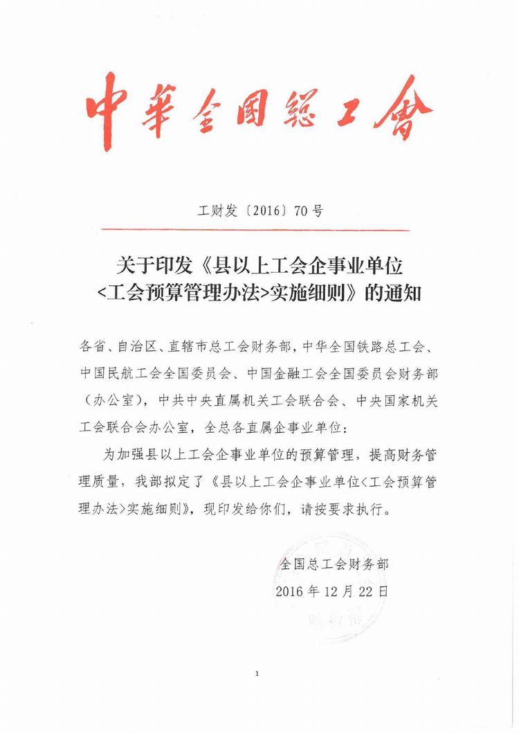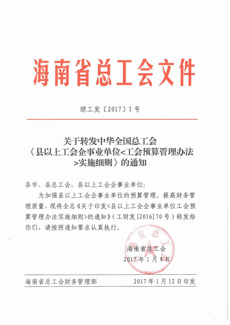 关于转发中华全国总工会《县以上工会企事业单位<工会预算管理办法>实施细则》的通知(琼工发〔2017〕1号)