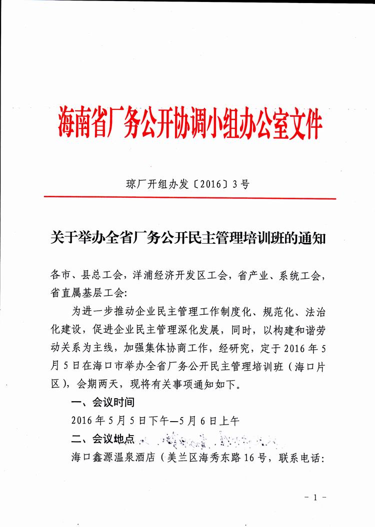 关于举办全省厂务公开民主管理培训班的通知(琼厂开组办发〔2016〕3号)
